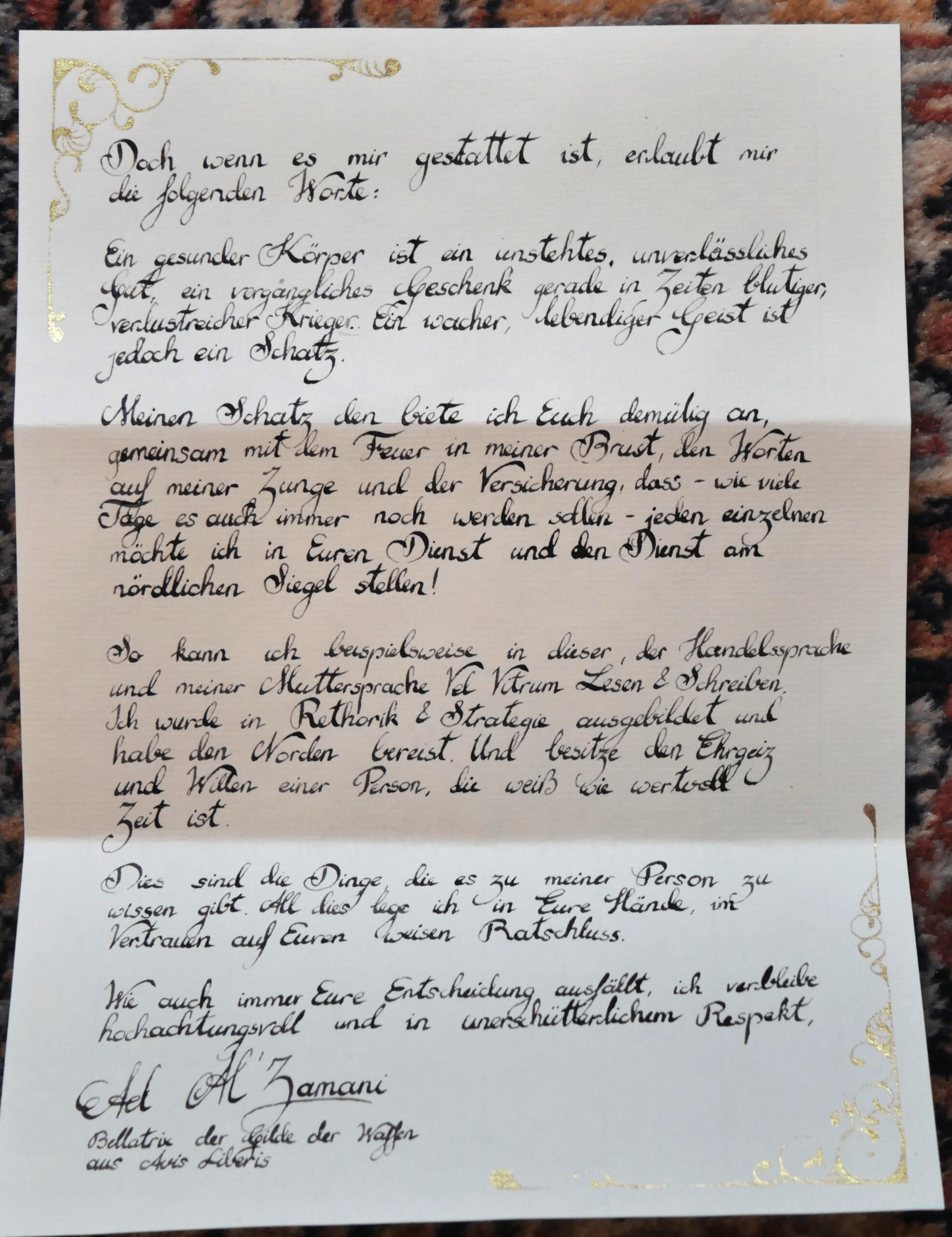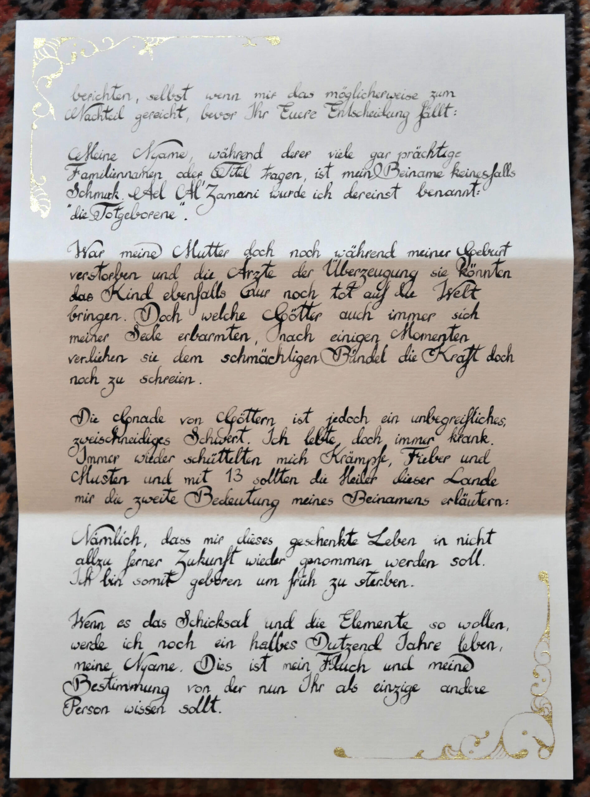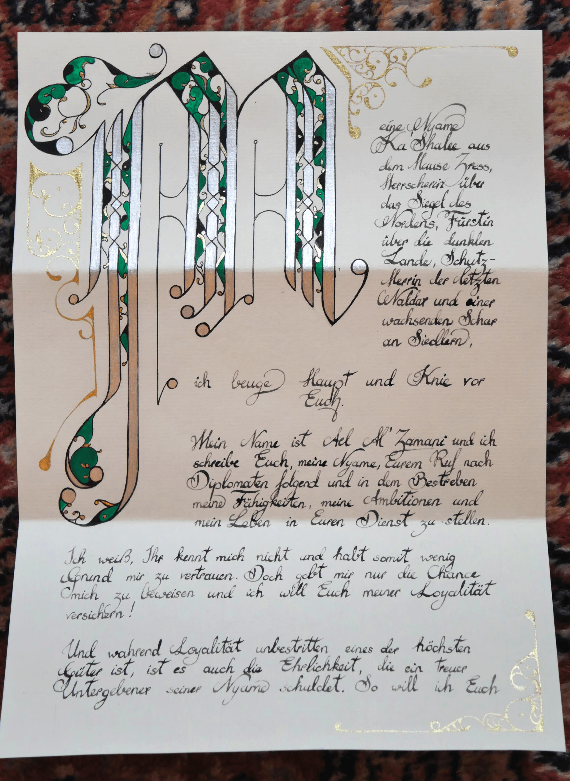 I started drawing pretty much the moment my mother gave a pencil to me and since then never stopped. Calligraphy came a bit later and only ever grew more on me over time.So far most of my artworks and sketchbooks are filled with personal pieces, OCs, Creature Designs and poems. Little pieces of scripture cover my walls, maps I drew and wrote myself, quotes and phrases I stumbled across and wanted to frame.With every commissions I did so far I noticed how I would love to make this passion of mine part of my professional carrier.So welcome to my Website! Linger around and take a look! Tell me your thoughts and lets make your ideas shine together!